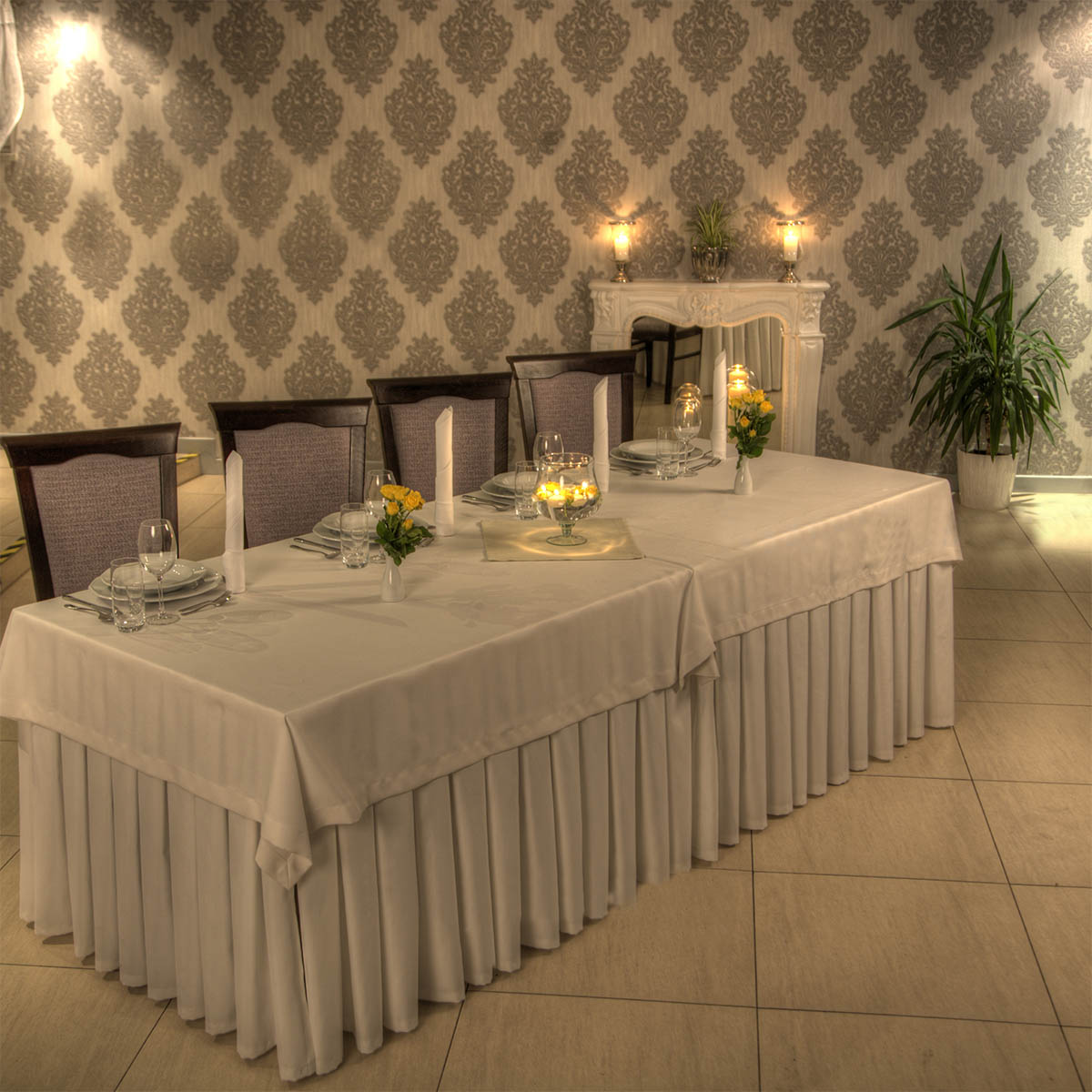 Dysponujemy kryształkową salą bankietową w której swobodnie możemy zorganizować przyjęcie weselne dla 50-60 os. Nowoczesna sala wyposażona jest w osobne wejście, toaletę, zaplecze dla obsługi, windę która sprawnie dostarczy potrawy z kuchni. Ponadto komfort imprezy zapewni klimatyzacja z systemem rekuperacji powietrza.